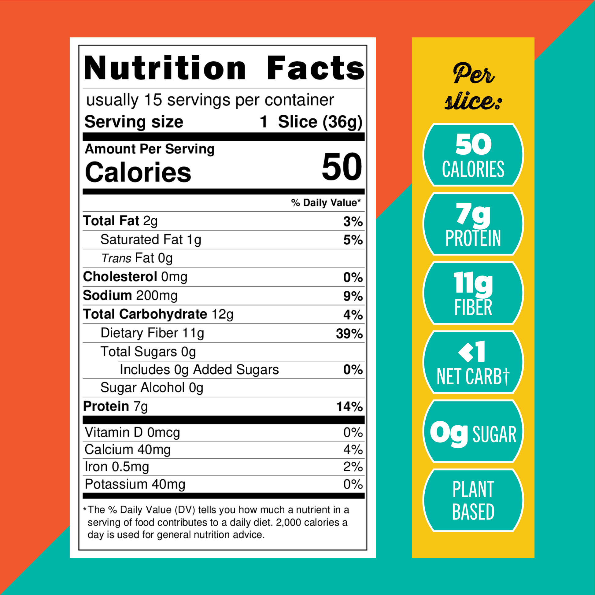 Our delicious sourdough style bread is hearty with a slightly sour flavor and a chewy texture that stands up to the heartiest sandwiches. It's so delicious, you'll forget it's also packed with incredible nutrition. Compared to regular sourdough bread, it has 5X more protein, 15X more fiber and 60 percent fewer calories - and under 1 net carb per slice.